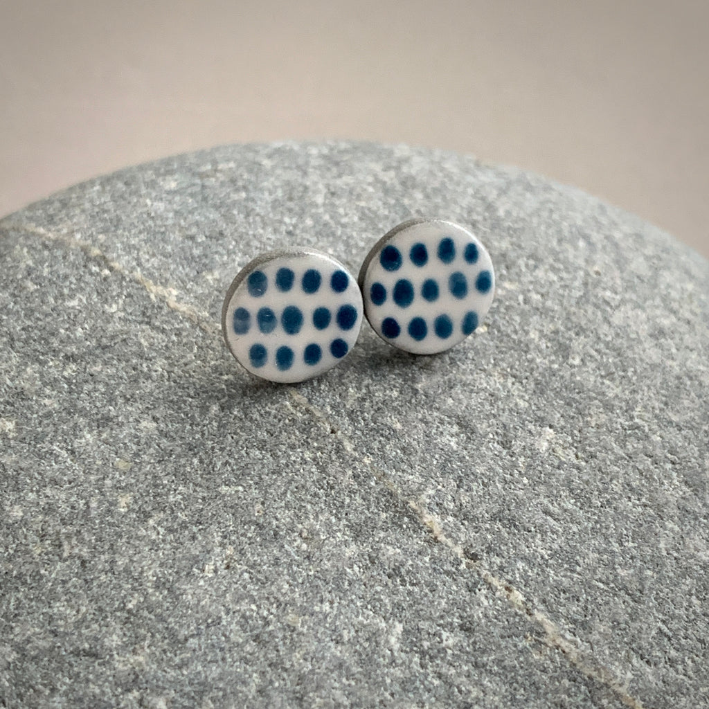 Handmade grey porcelain stud earrings with white slip, a hand painted dots design and sterling silver posts and scrolls.
