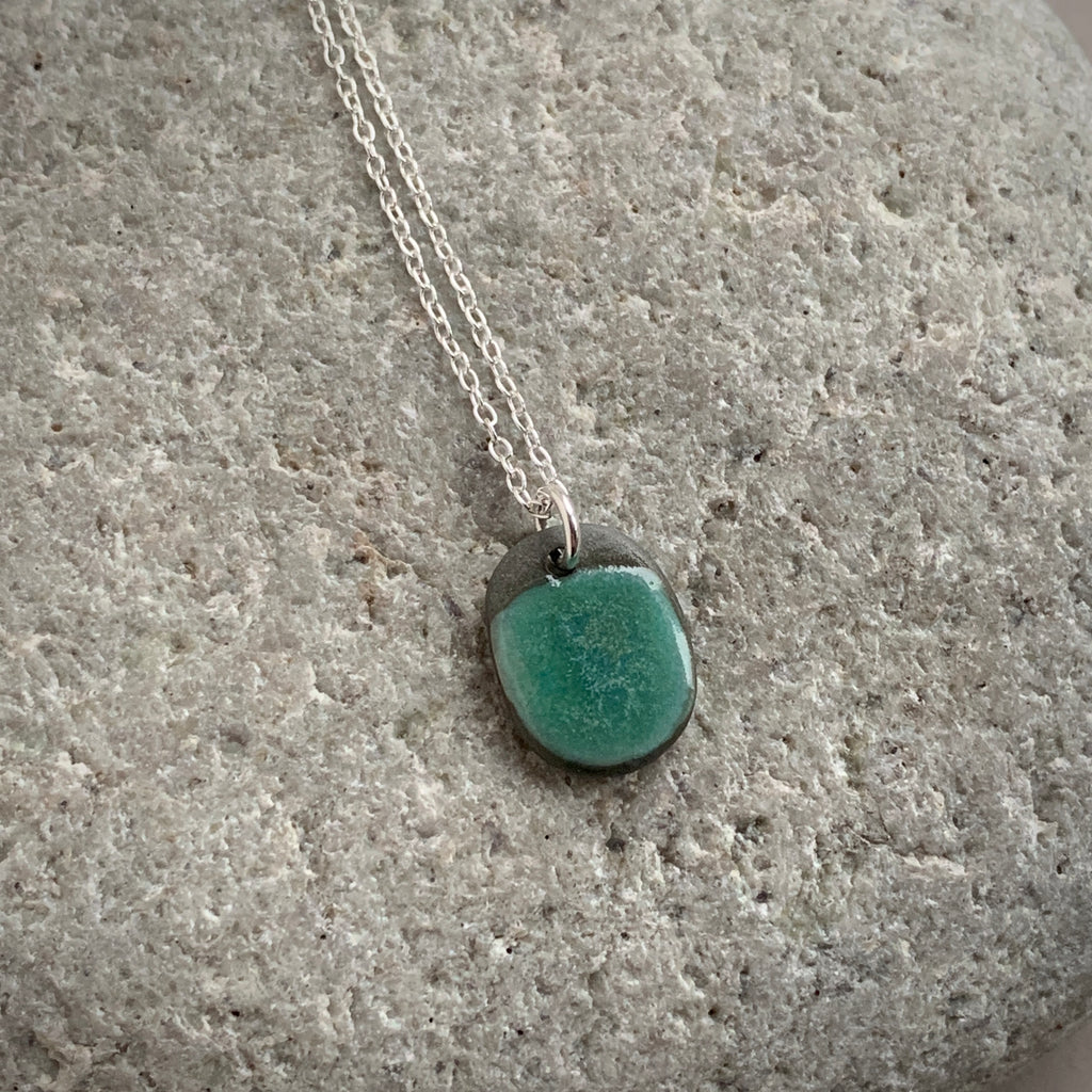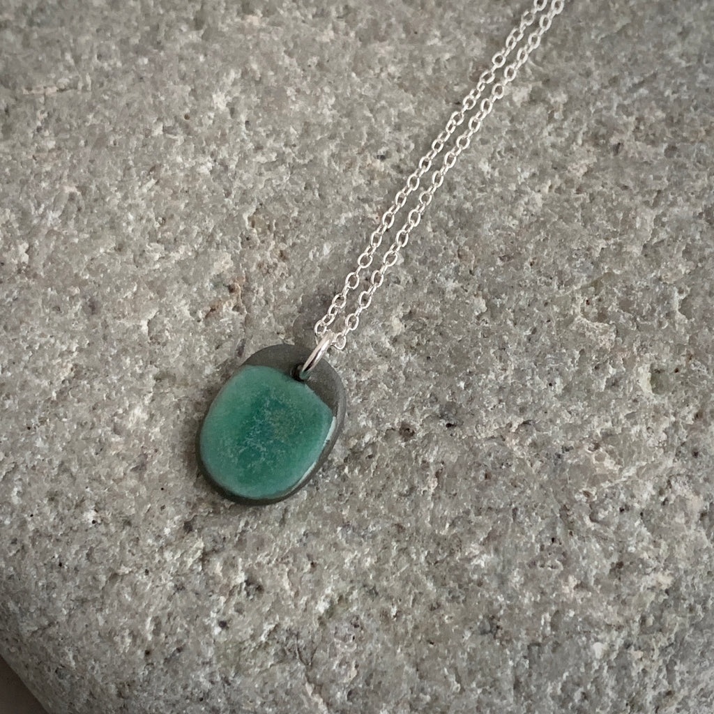 A handmade grey porcelain necklace with a hand painted layered sea green glaze and an eco friendly recycled sterling silver chain.