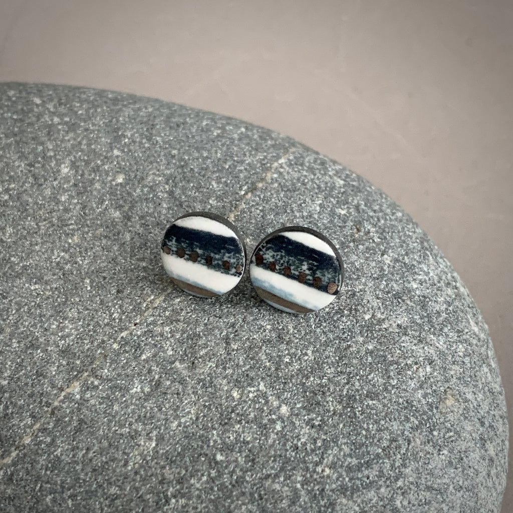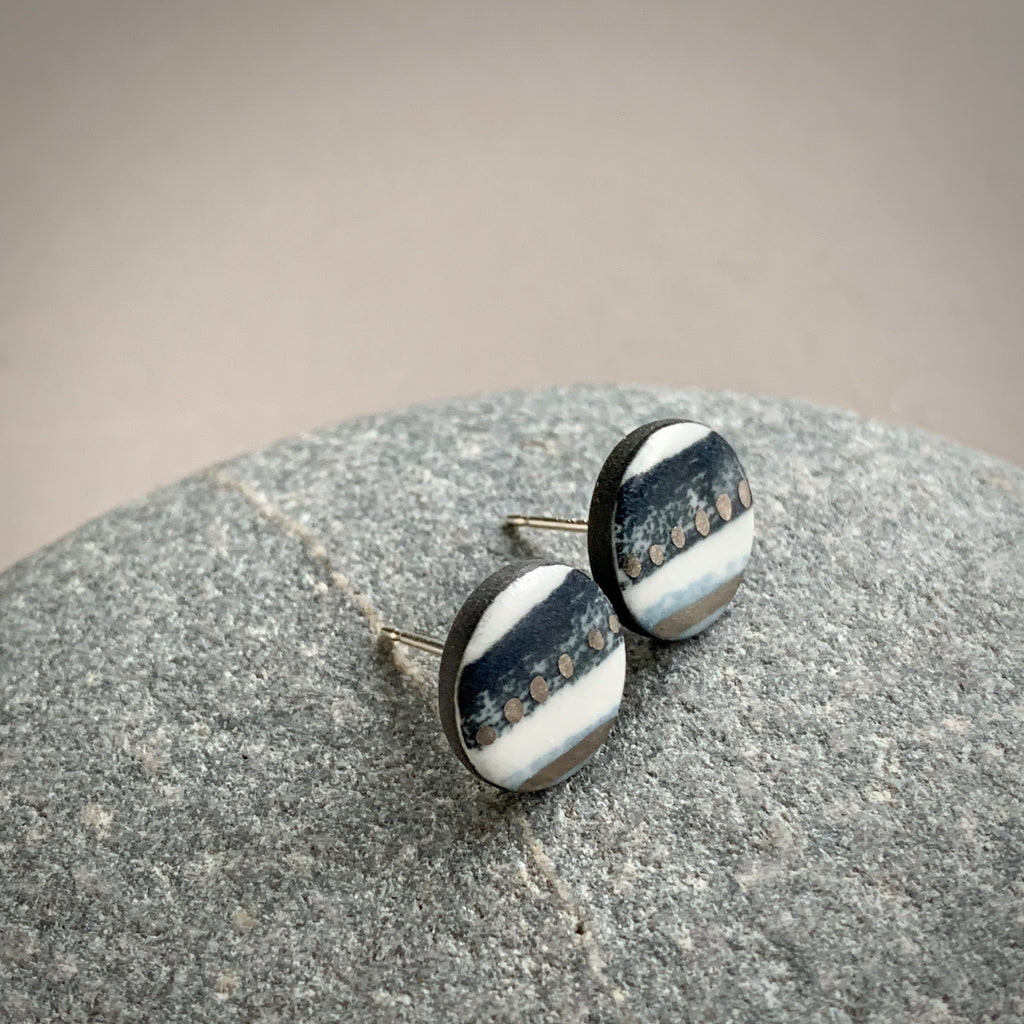 Hand painted and monoprinted one-off pair of stud earrings based on landscape sketchbook drawings. Made from black porcelain clay with platinum details and sterling silver posts and scrolls.