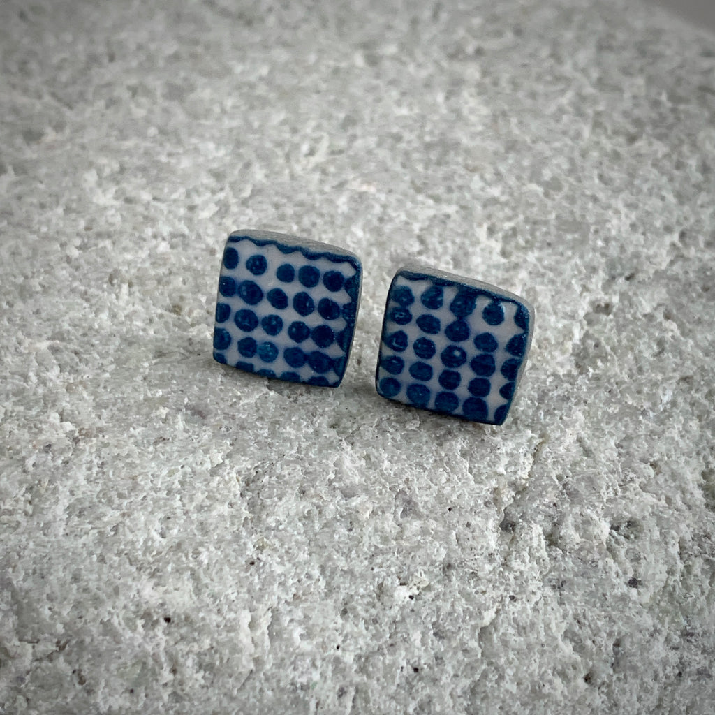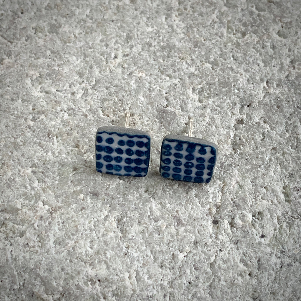 Hand painted and monoprinted one-off pair of square stud earrings. Made from grey high fired porcelain clay with a matte glaze. The studs have recycled sterling silver posts and scrolls.