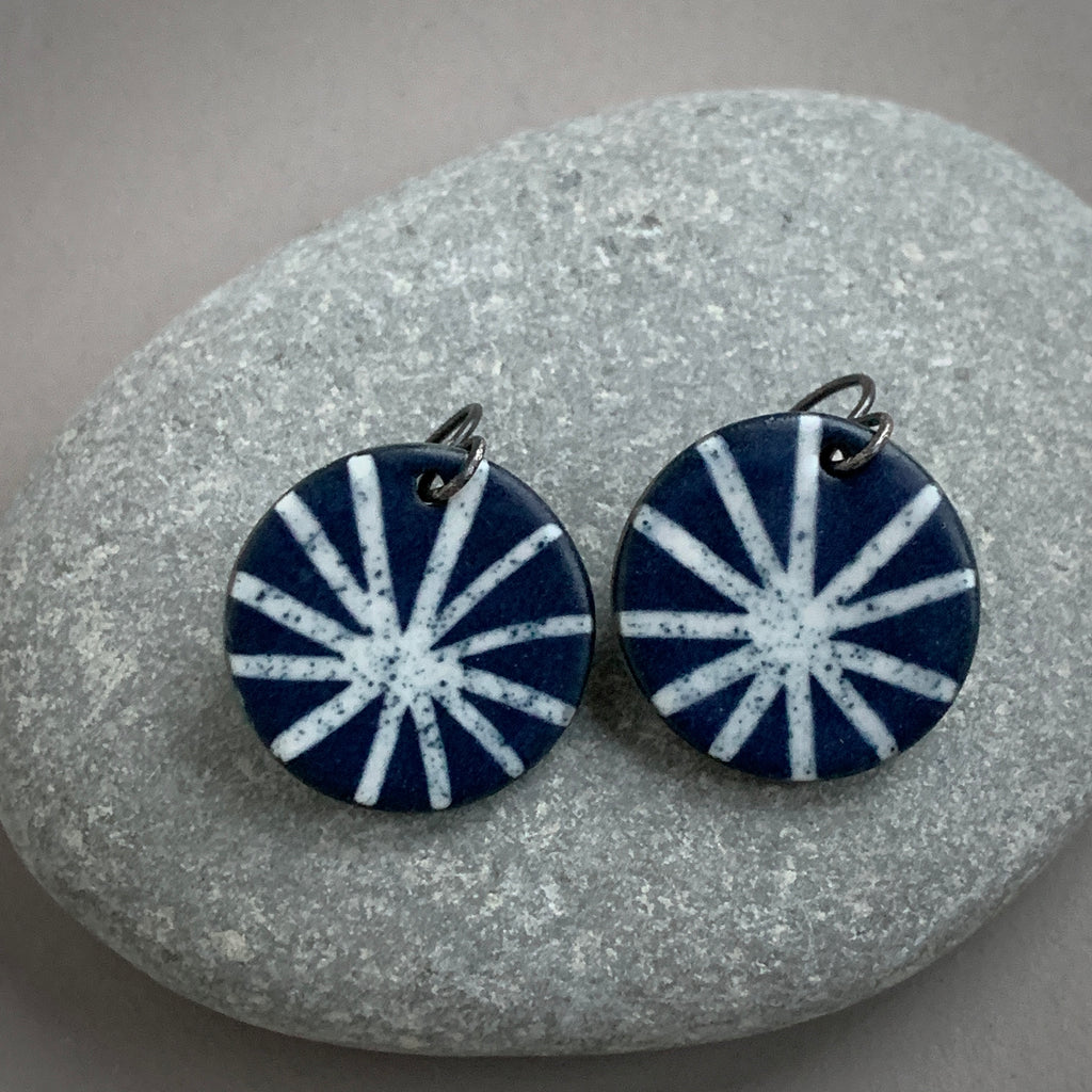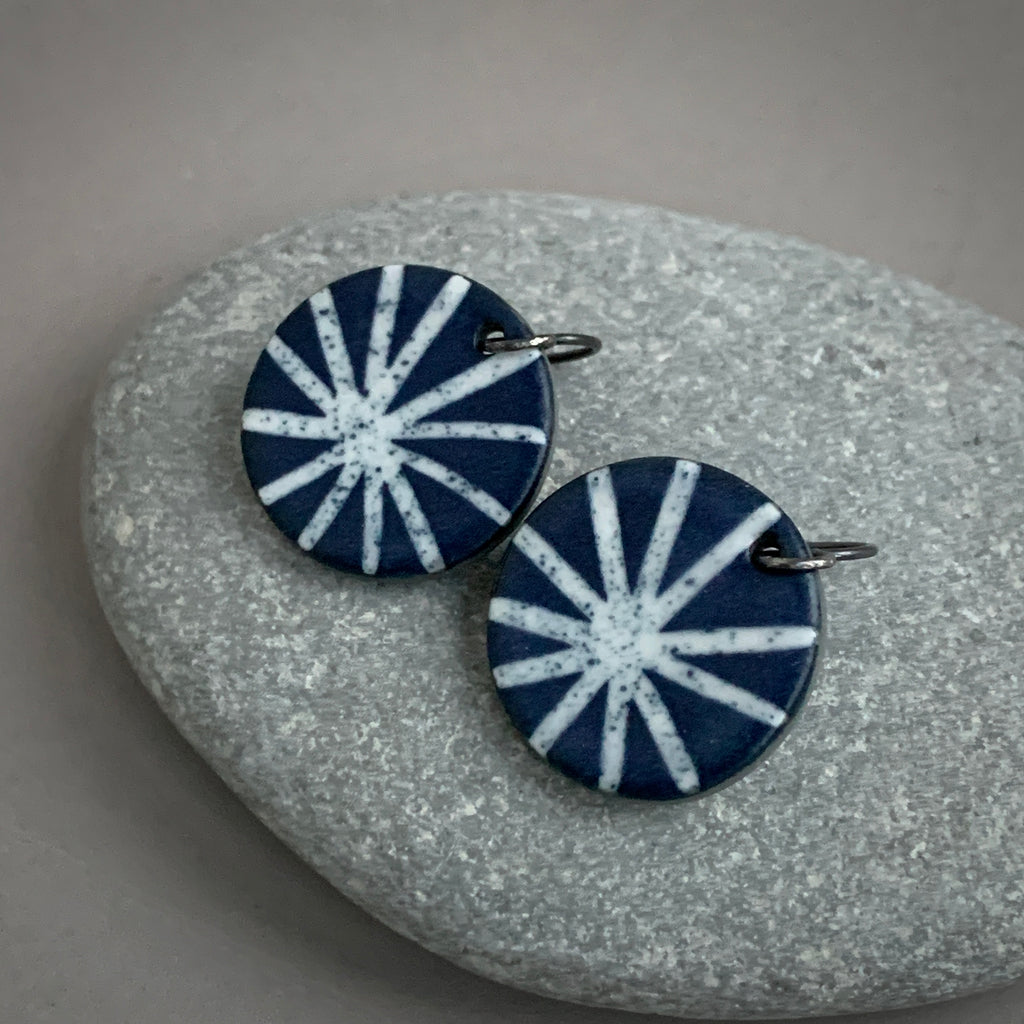 Handmade black porcelain and recycled sterling silver earrings with a hand painted indigo and white star design.