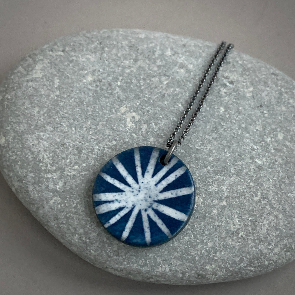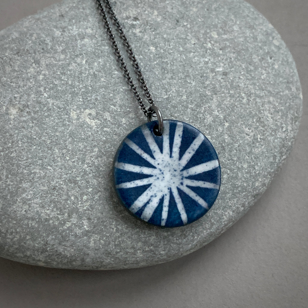 Handmade one-off black porcelain necklace with a hand painted indigo and white star design. The chain is oxidised recycled sterling silver and measures 18 inches.