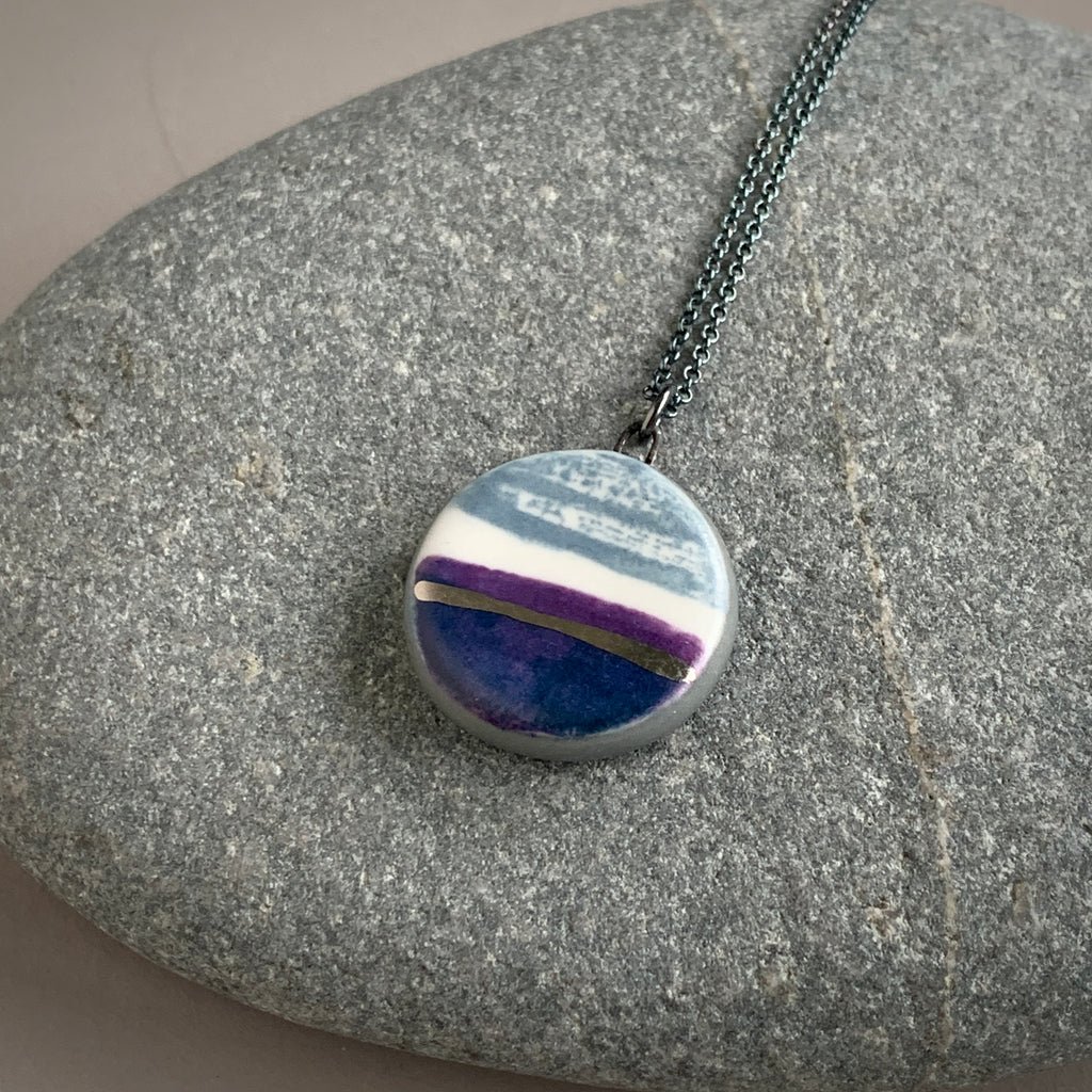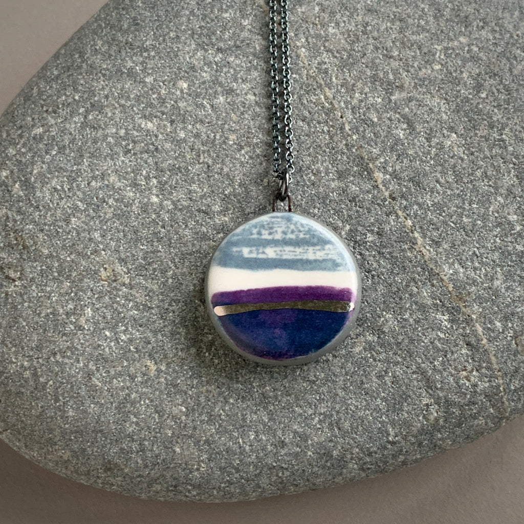 Hand painted and monoprinted one-off necklace based on landscape sketchbook drawings. Made from grey porcelain clay and an oxidised eco friendly recycled sterling silver chain. The pendant has platinum fired onto the surface of the ceramic glaze.