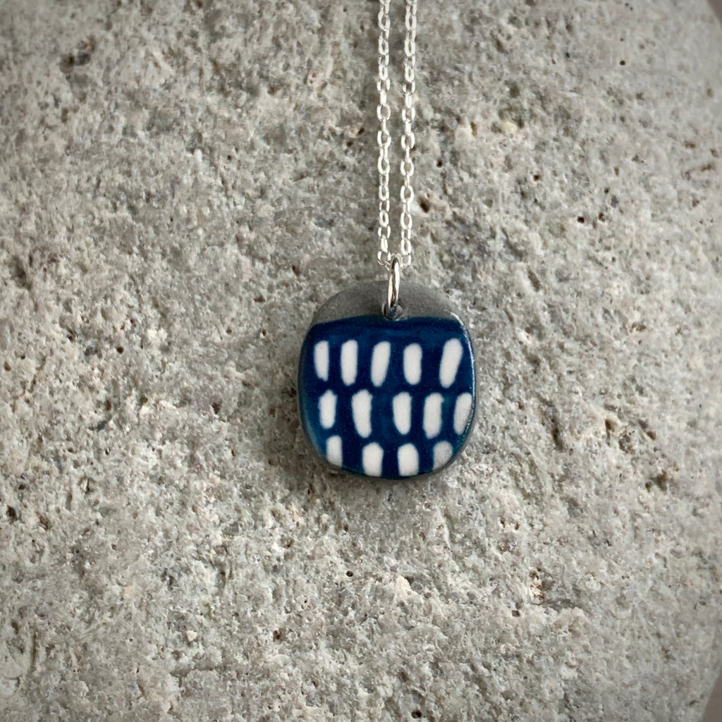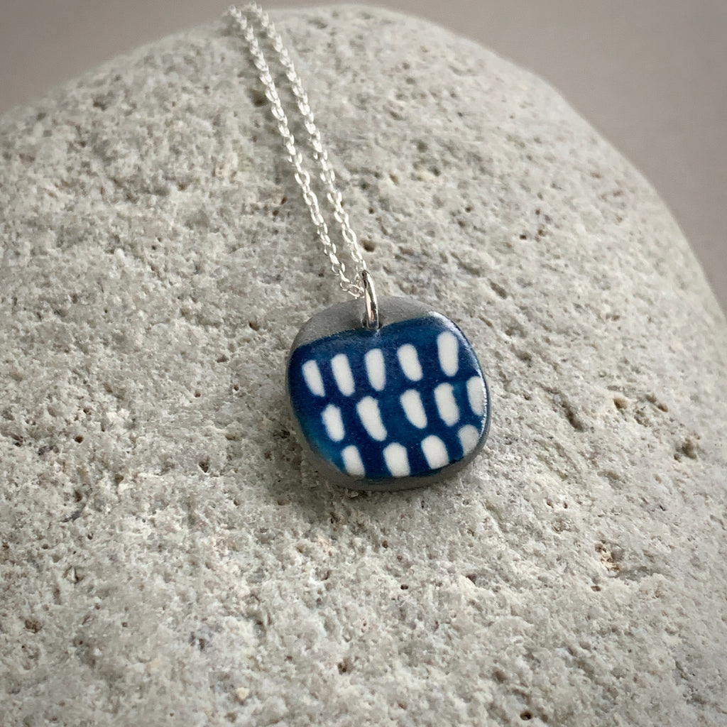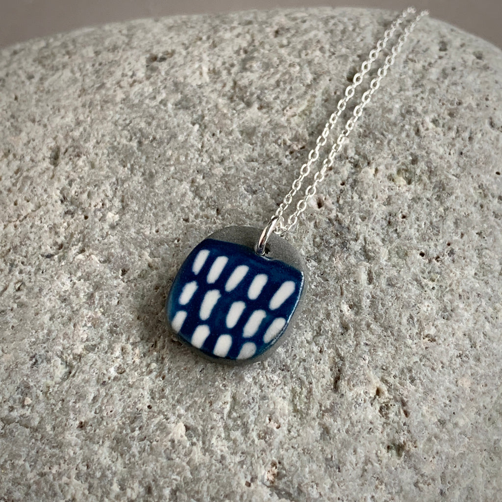 A handmade grey porcelain necklace with white slip, a hand painted dots design, and an eco friendly recycled sterling silver chain.