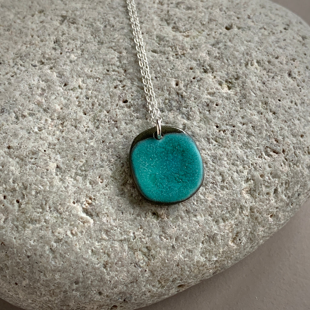 A handmade grey porcelain necklace with a hand painted, layered aqua glaze, and an eco friendly recycled sterling silver chain.