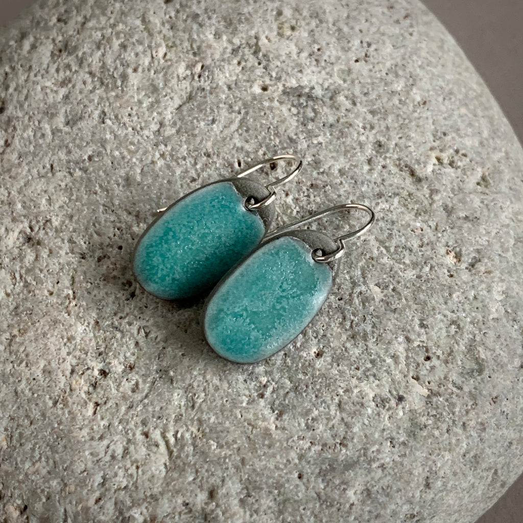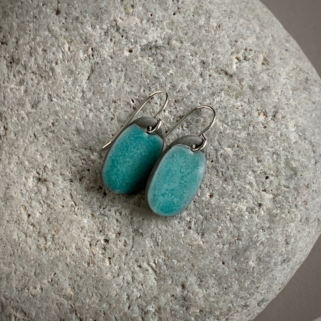 Handmade grey porcelain and recycled sterling silver earrings inspired by the sea and coastal landscape, with a hand painted, layered seafoam glaze.