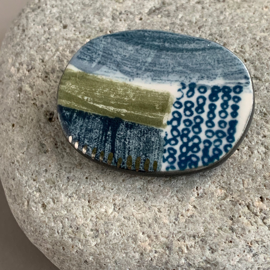 A one-off hand painted and monoprinted brooch based on landscape sketchbook drawings, made from grey stoneware clay with porcelain slip, and finished with platinum details.