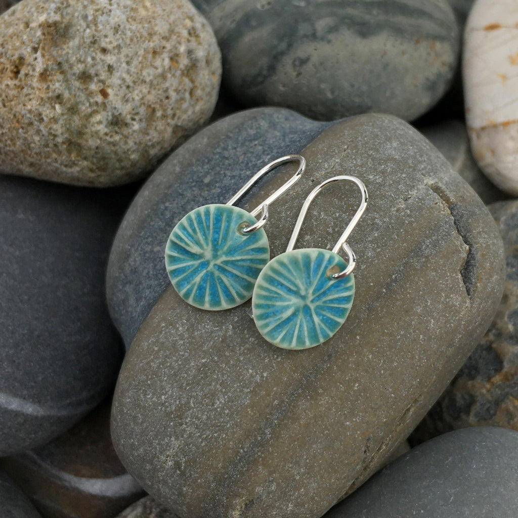 A pair of handmade porcelain and recycled sterling silver earrings with an aqua glaze and star design.