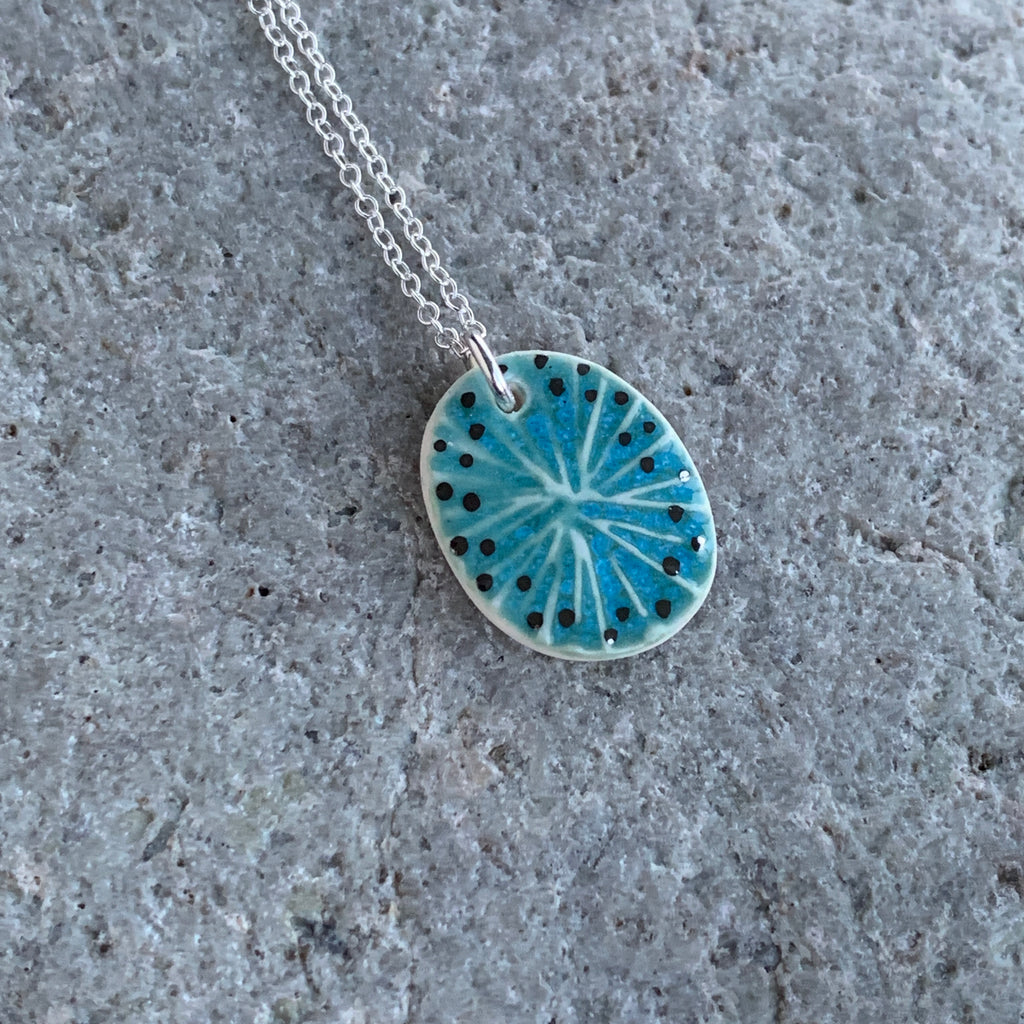 A handmade porcelain necklace with an aqua star design, platinum details and an eco friendly recycled sterling silver chain.
