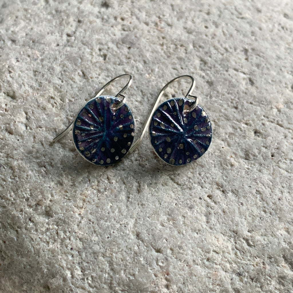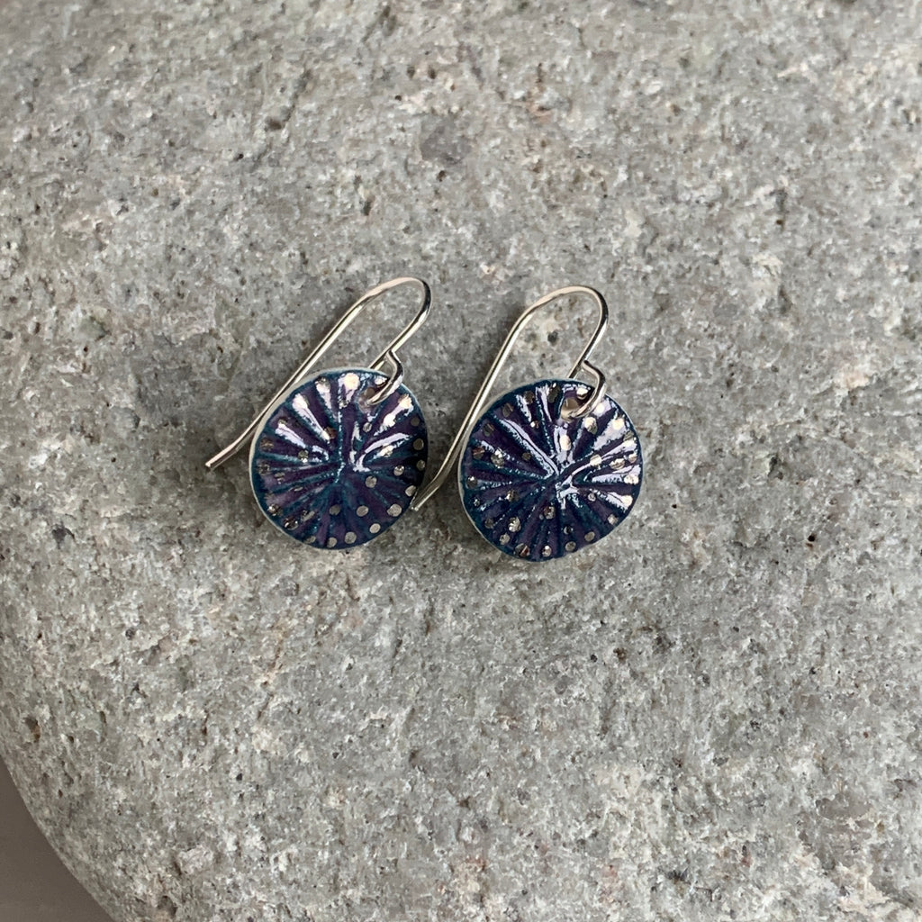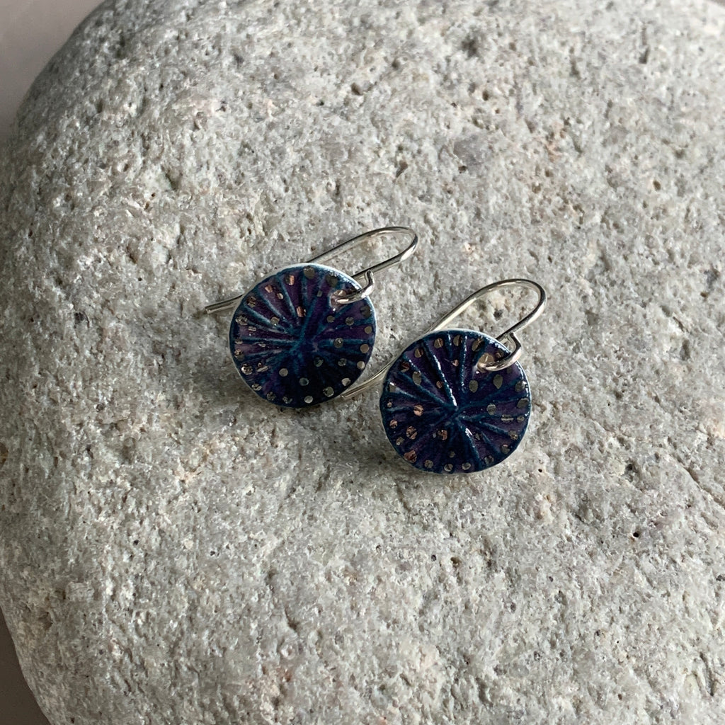 A pair of handmade porcelain and recycled sterling silver earrings with a berry glaze and platinum details.