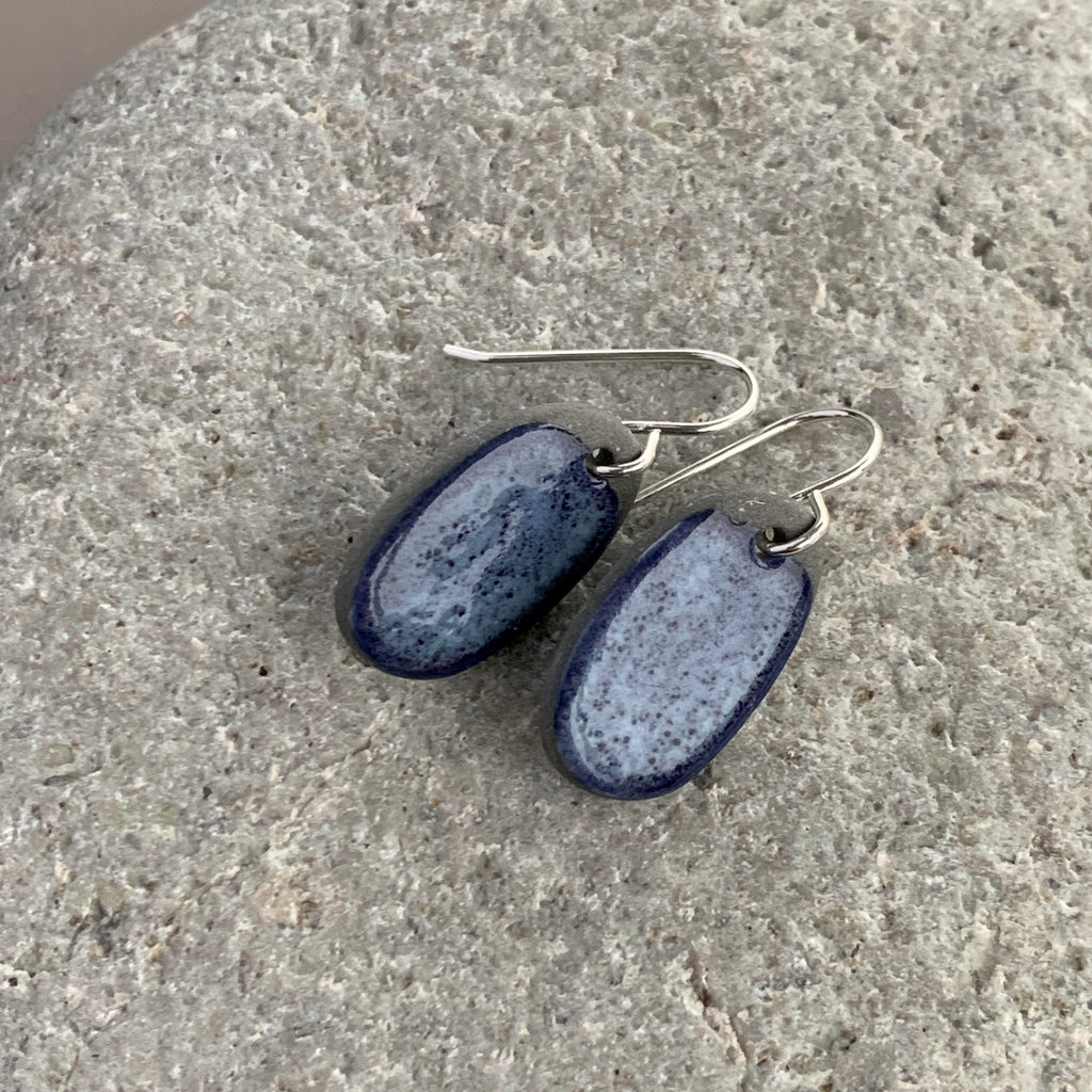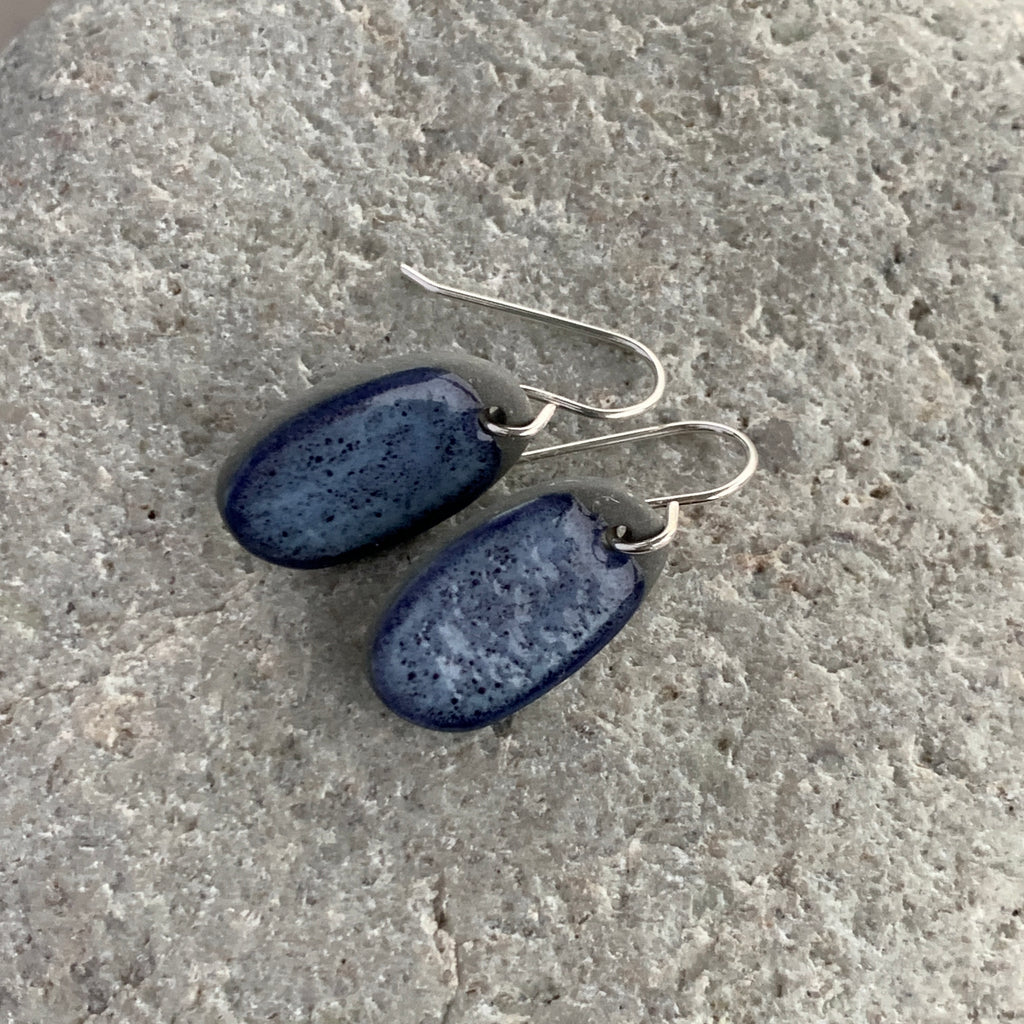 Hand made pebble shaped earrings. Made from high fired grey porcelain clay with a bilberry glaze. The earrings have sterling silver hooks.