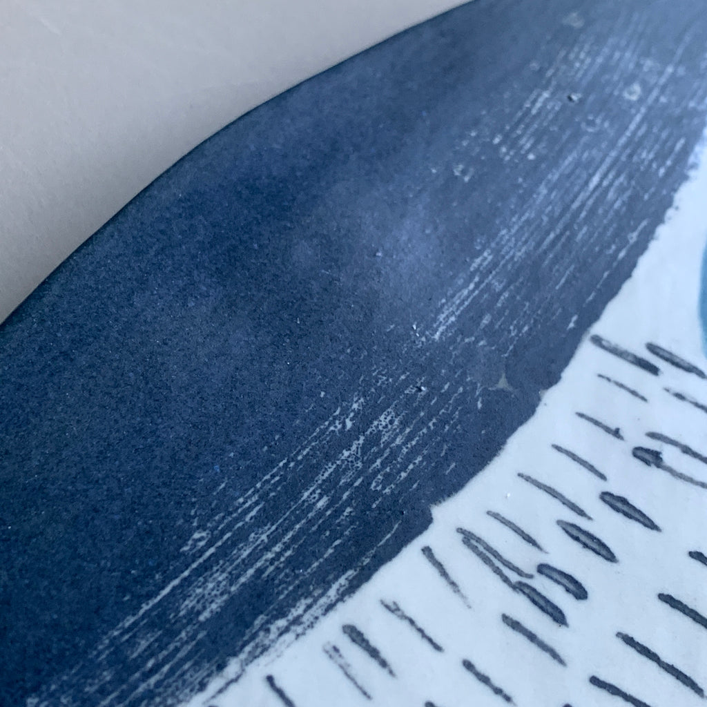 A one-off, handmade wall piece based on my landscape sketchbook drawings and photographs of snowy fields against a dark sky. I have used high fired stoneware clay and white porcelain slip, and then added many layers of mark making and monoprinting between firings.