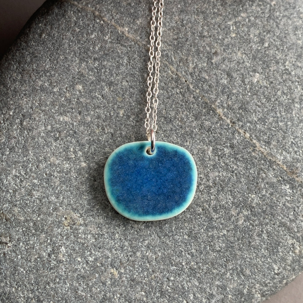 Hand made one-off necklace. Made from high fired porcelain clay with a deep blue / turquoise glaze. The necklace has an 18 inch sterling silver chain.