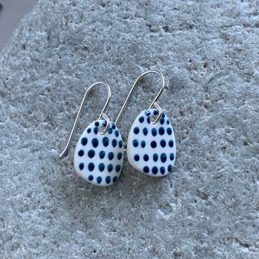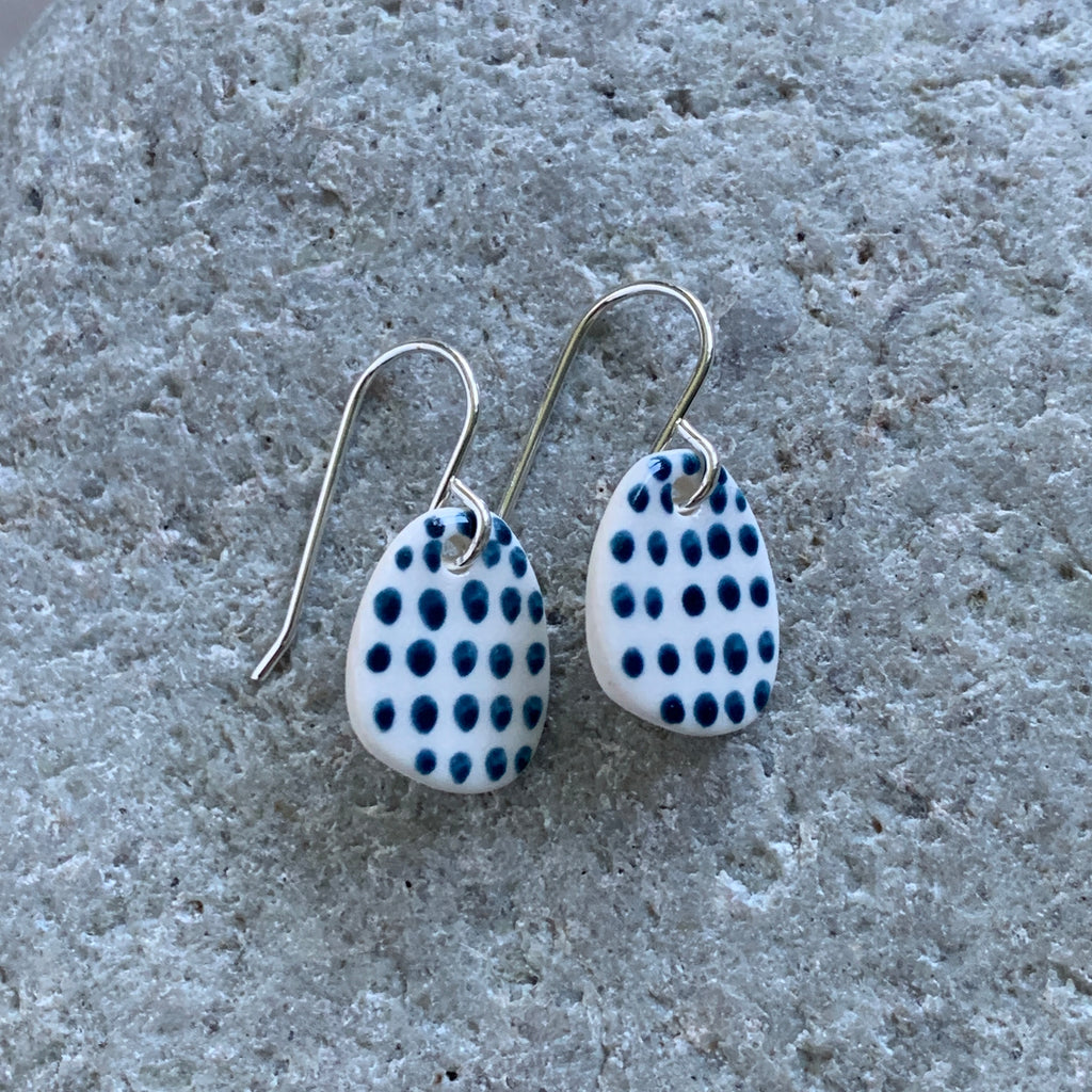 A pair of handmade porcelain and recycled sterling silver earrings with a hand painted design.