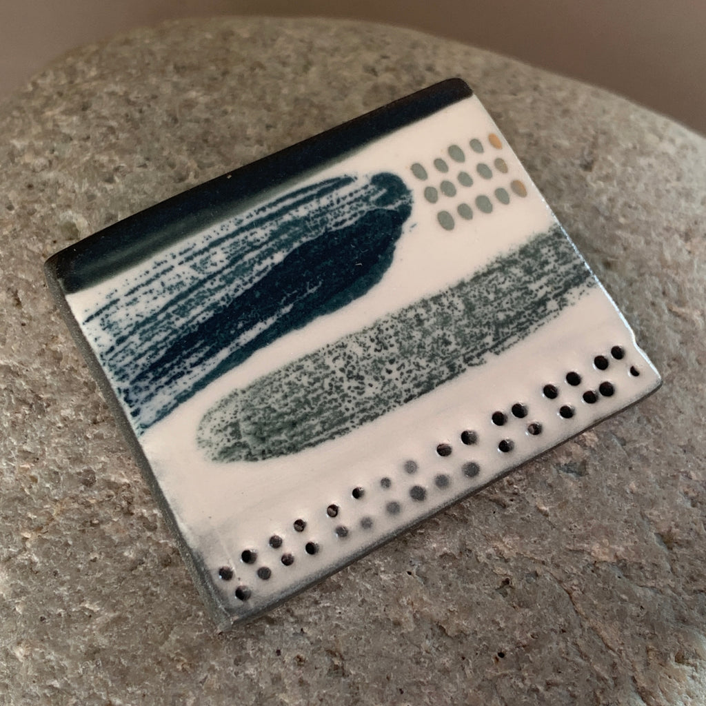 Hand painted and monoprinted one-off landscape brooch inspired by sketchbook drawings. Made from black high fired porcelain clay with a satin glaze and platinum details.