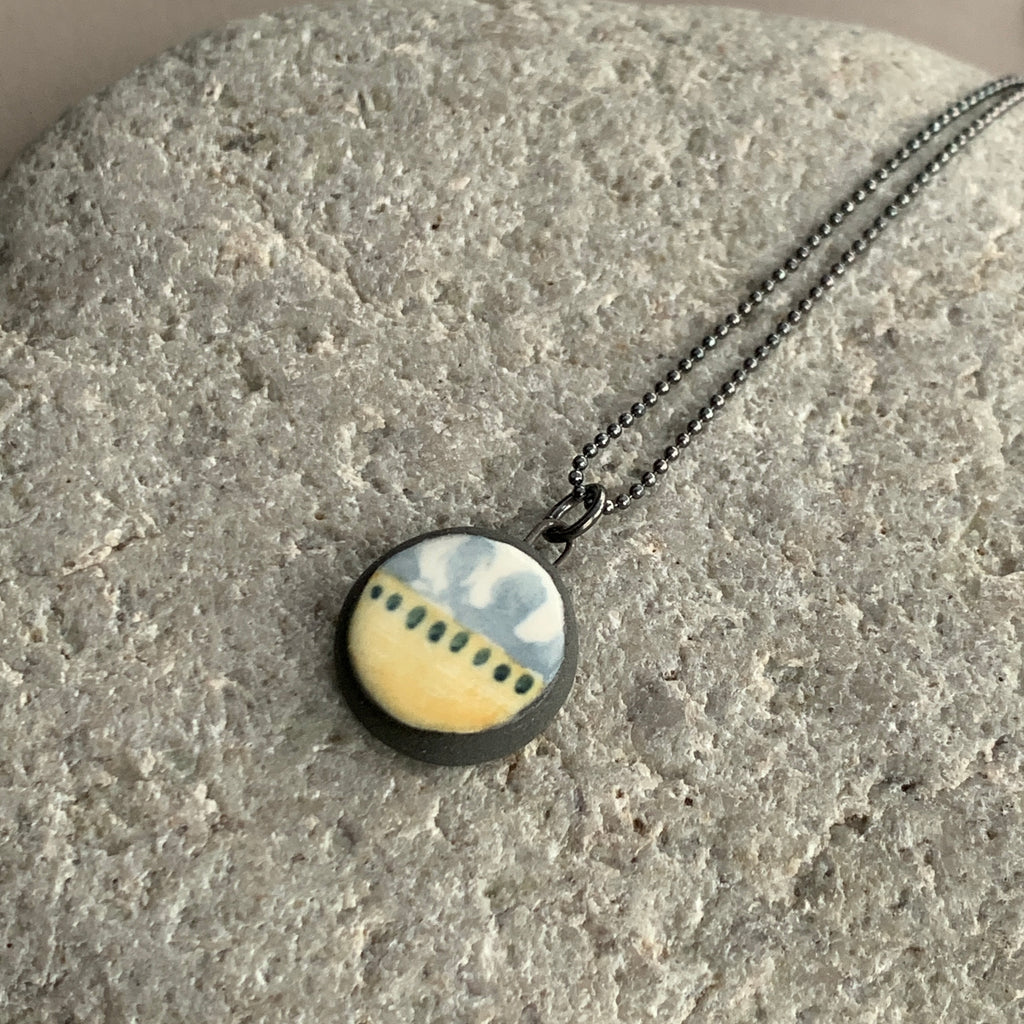 Hand made one-off landscape necklace. Made from high fired black porcelain clay with a hand painted and printed design. The necklace has an 18 inch oxidised sterling silver chain.