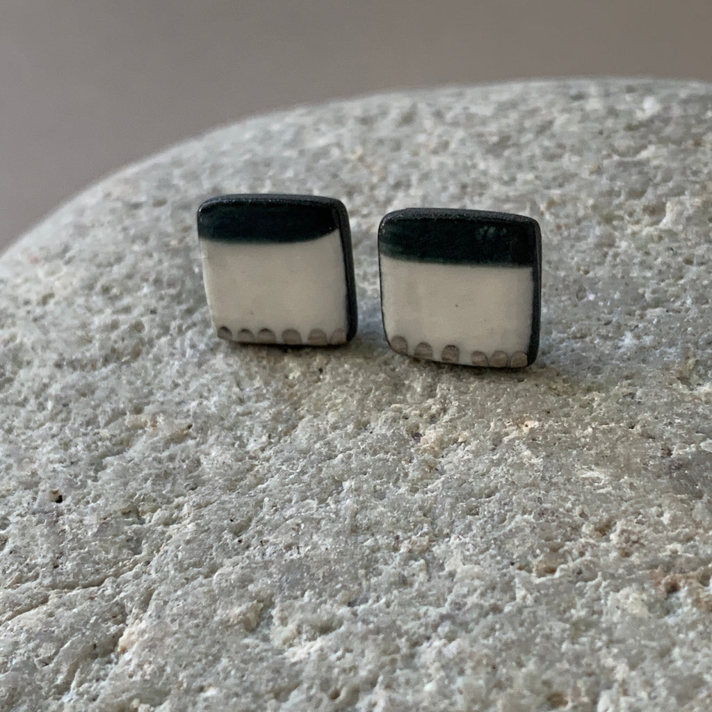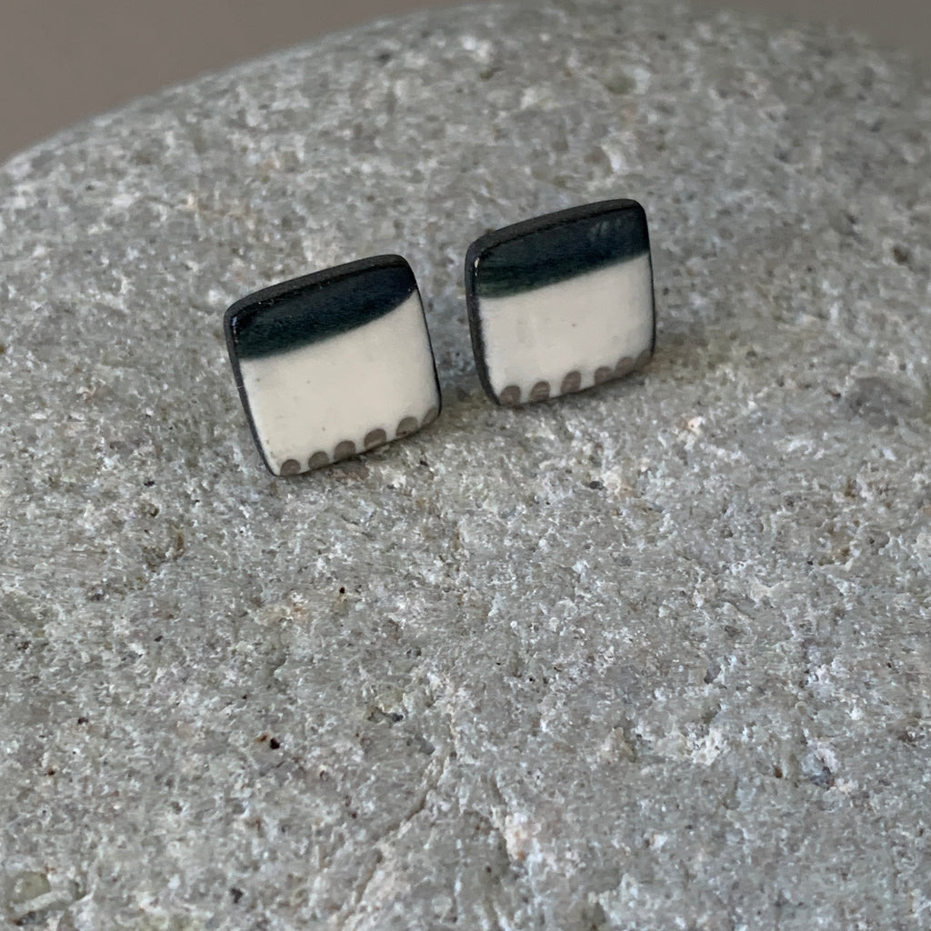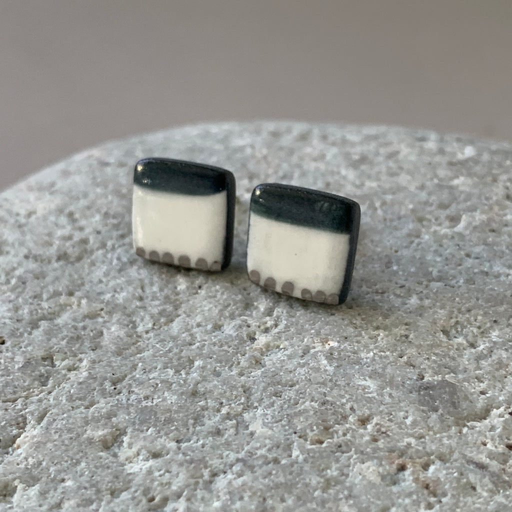 Hand painted one-off square studs. Made from high fired black porcelain clay with platinum details. The studs have sterling silver posts and scrolls.