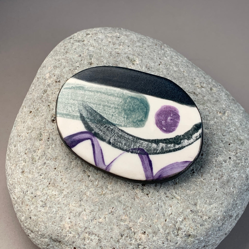 Hand painted and monoprinted one-off landscape brooch inspired by sketchbook drawings. Made from grey high fired stoneware clay with a satin glaze.