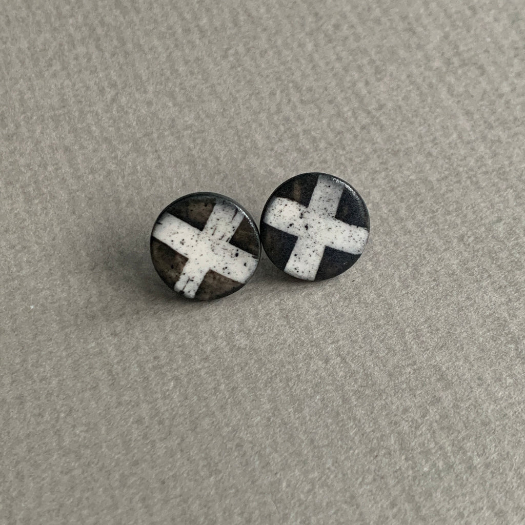 Hand painted one-off pair of large monochrome statement stud earrings. Made from black high fired porcelain clay with a matte glaze. The studs have sterling silver posts and scrolls.