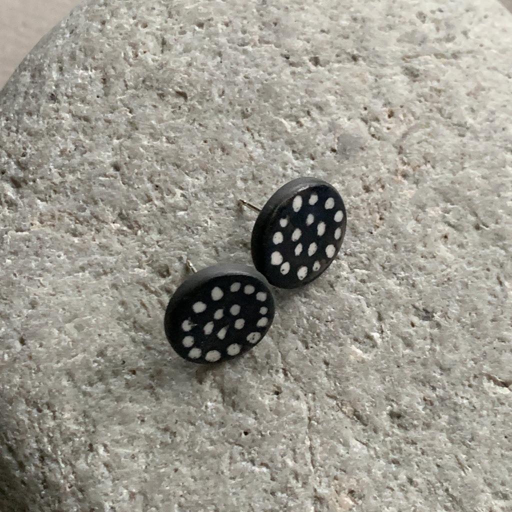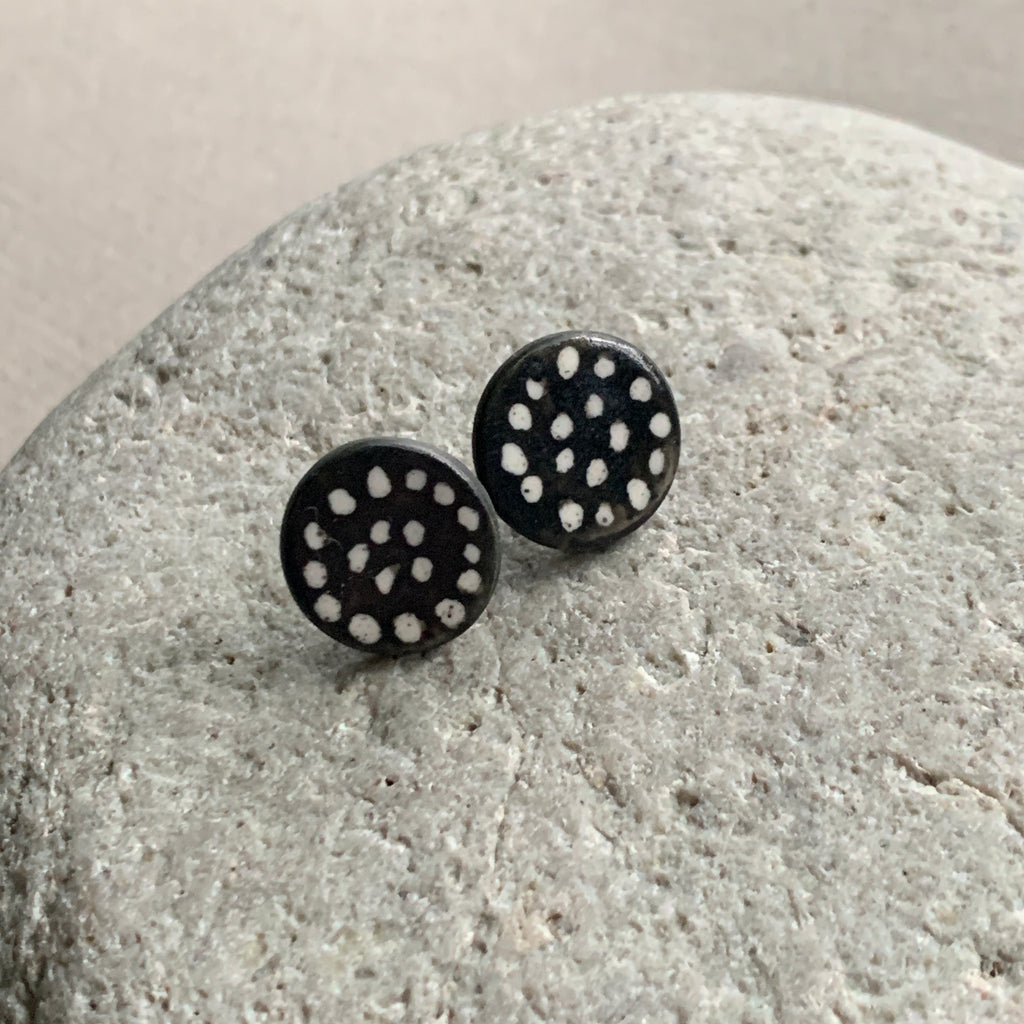 Hand painted one-off pair of large monochrome statement stud earrings. Made from black high fired porcelain clay with a matte glaze. The studs have sterling silver posts and scrolls.
