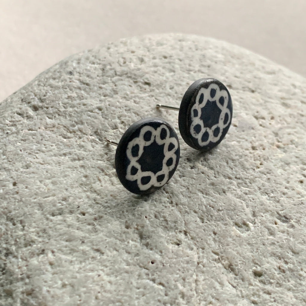 Hand painted one-off pair of large monochrome statement stud earrings. Made from black high fired porcelain clay with a matte glaze. The studs have sterling silver posts and scrolls.