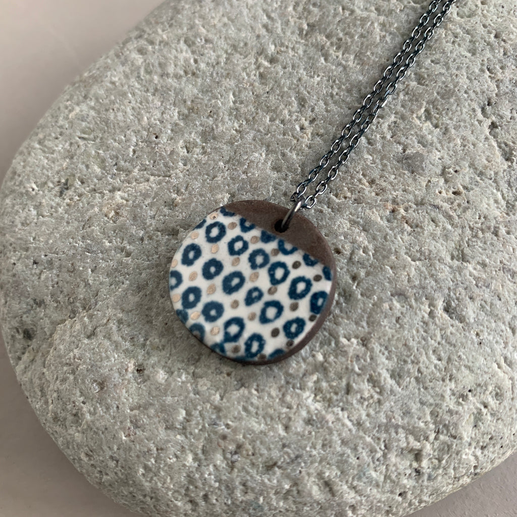 Hand made one-off necklace. Made from high fired black stoneware clay with a hand printed design and platinum lustre details. The necklace has an 18 inch oxidised sterling silver chain.