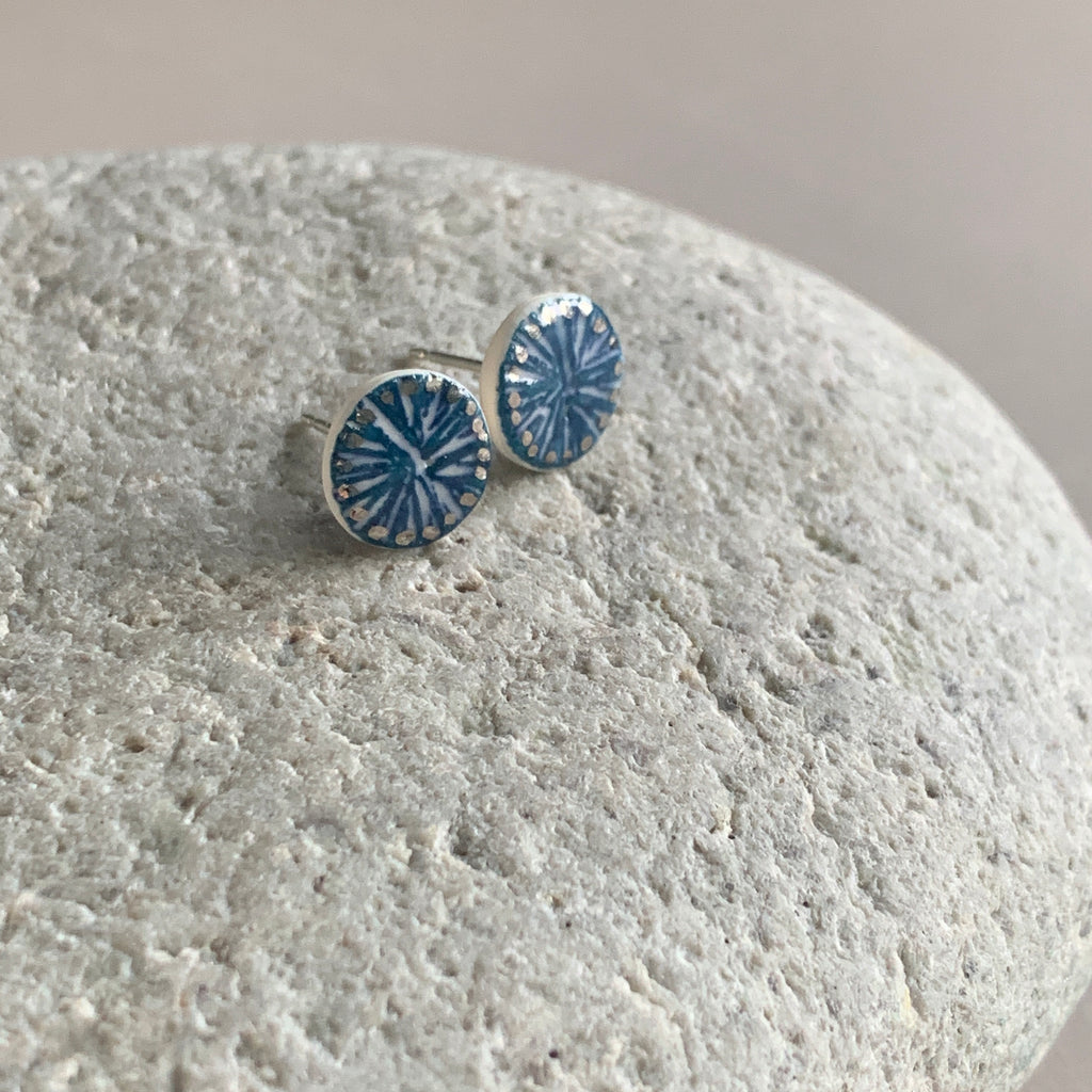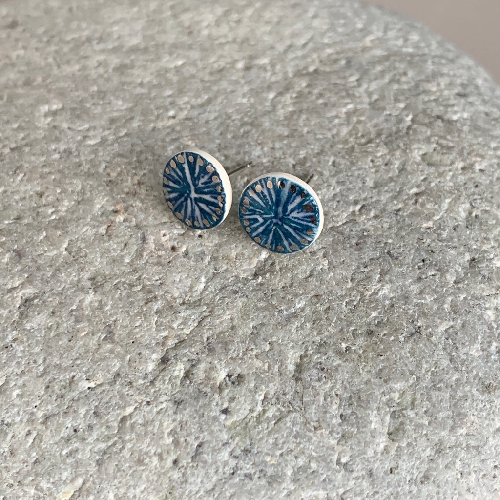 Hand painted pair of indigo stud earrings. Made from high fired porcelain clay with platinum details. The studs have sterling silver posts and scrolls.