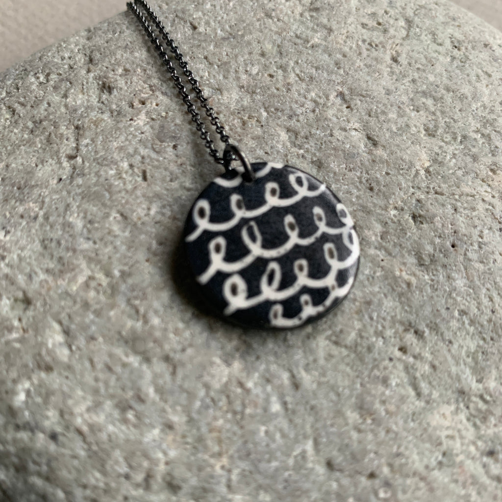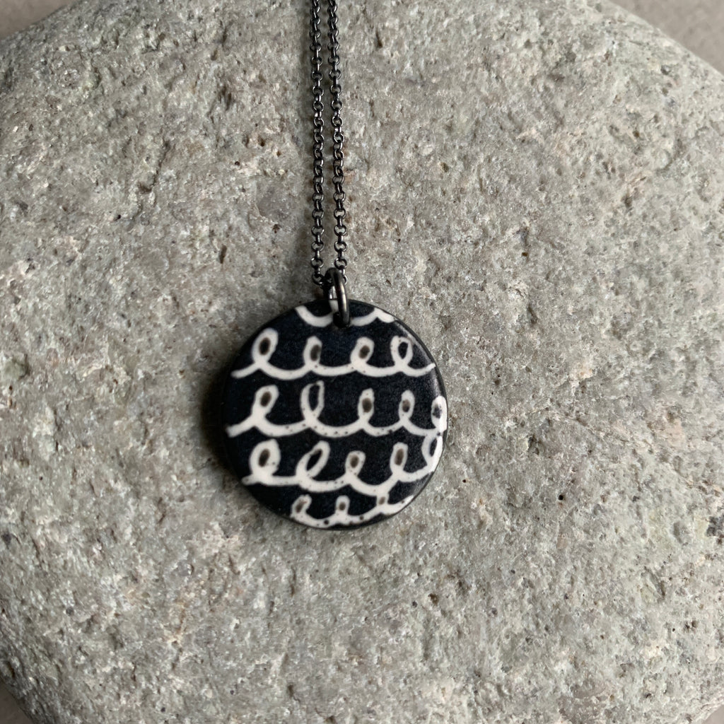 Hand painted one-off monochrome scribble necklace. Made from black high fired porcelain clay with a matte glaze.