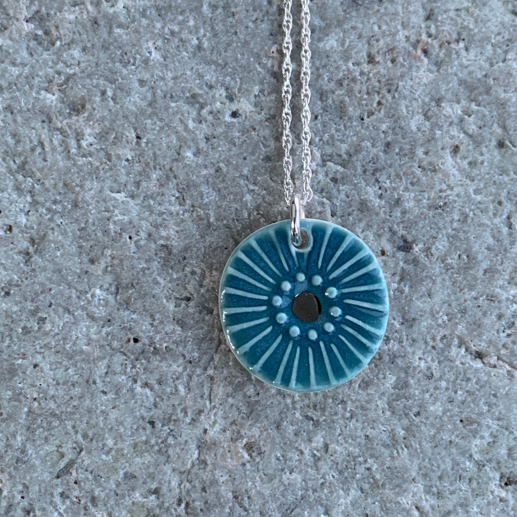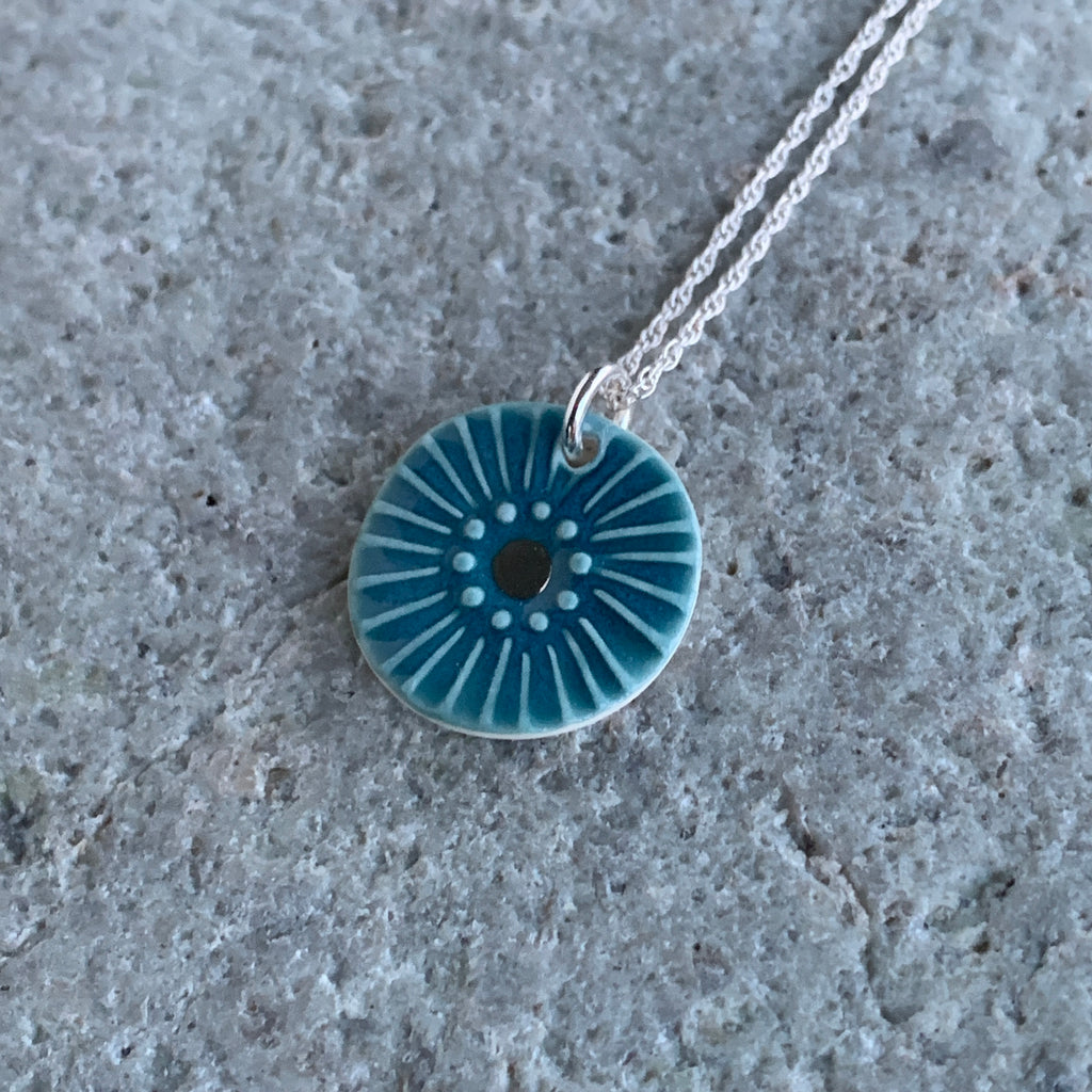 A handmade porcelain necklace with a sea green urchin design, platinum details and an eco friendly recycled sterling silver chain.