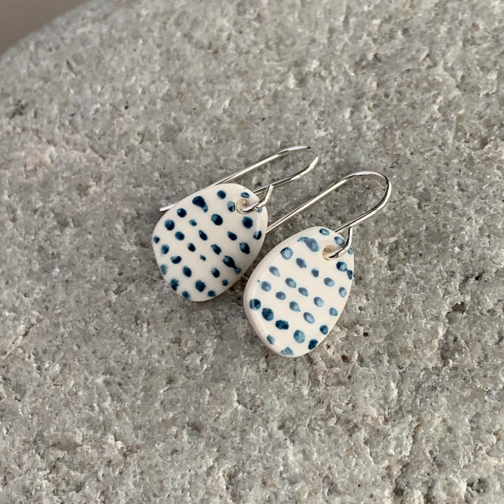 Hand painted one-off pair of pebble shaped earrings. Made from high fired porcelain clay with a shiny glaze. The earrings have sterling silver hooks.