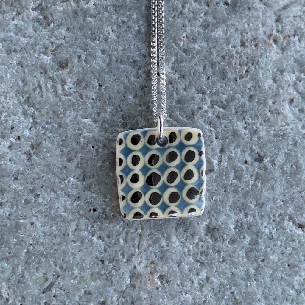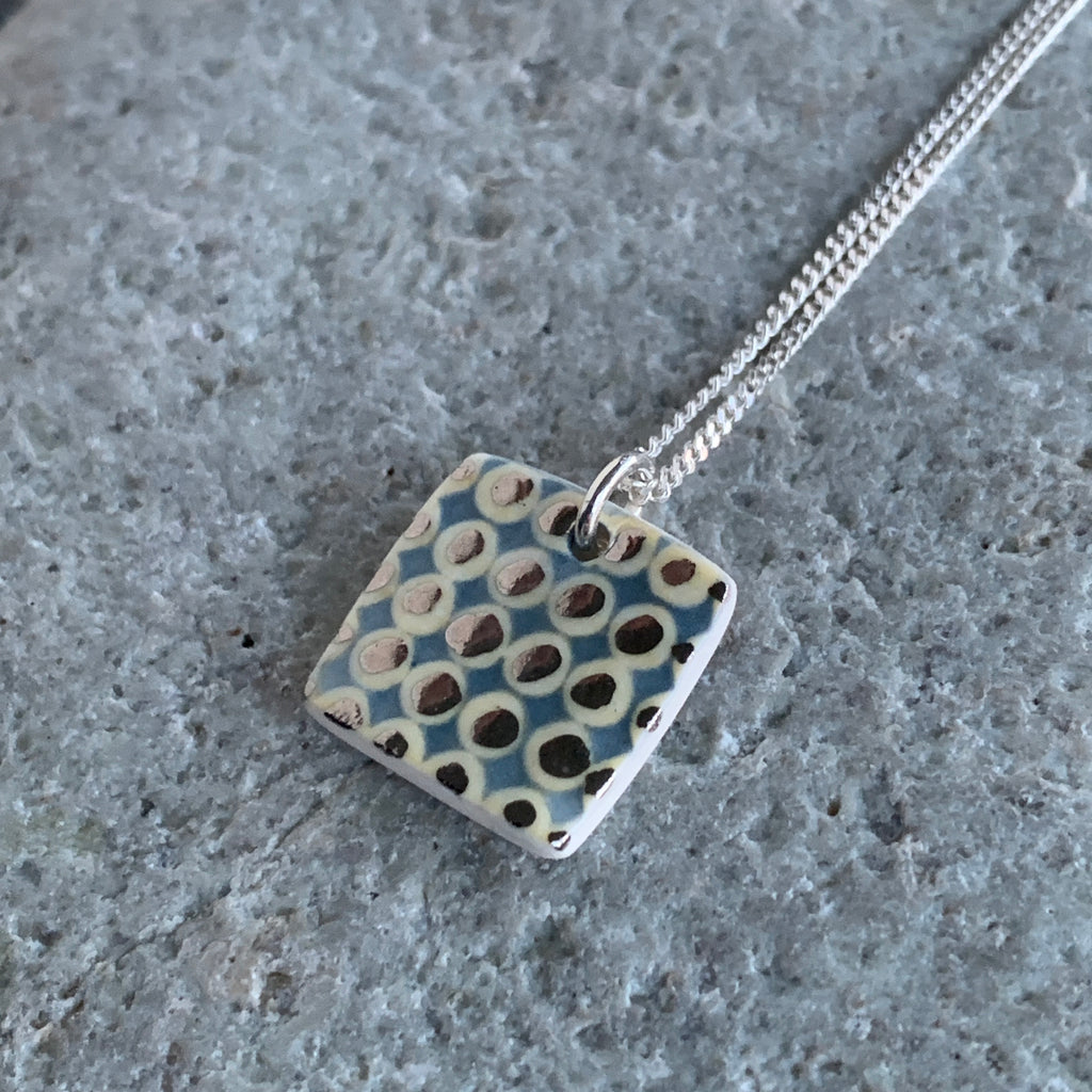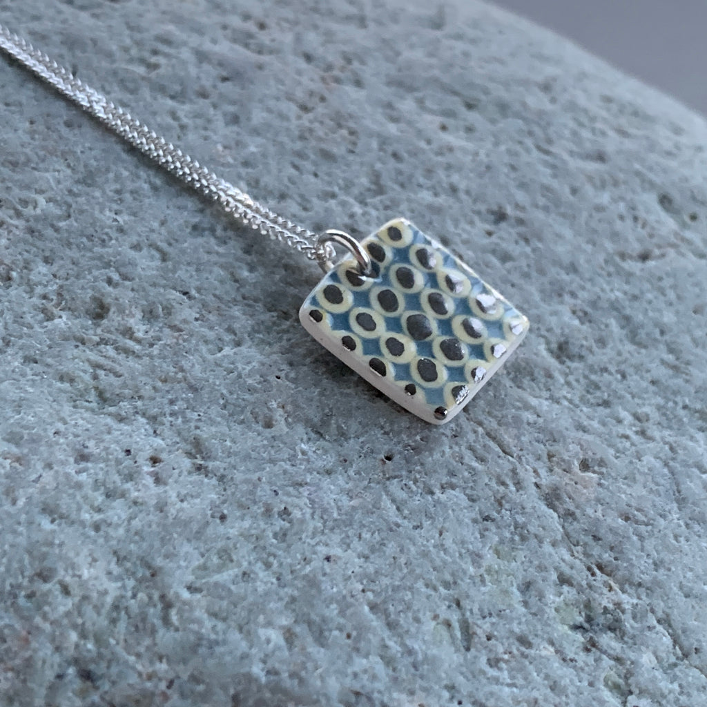 A handmade porcelain necklace with a yellow and grey design, platinum details and an eco friendly recycled sterling silver chain.