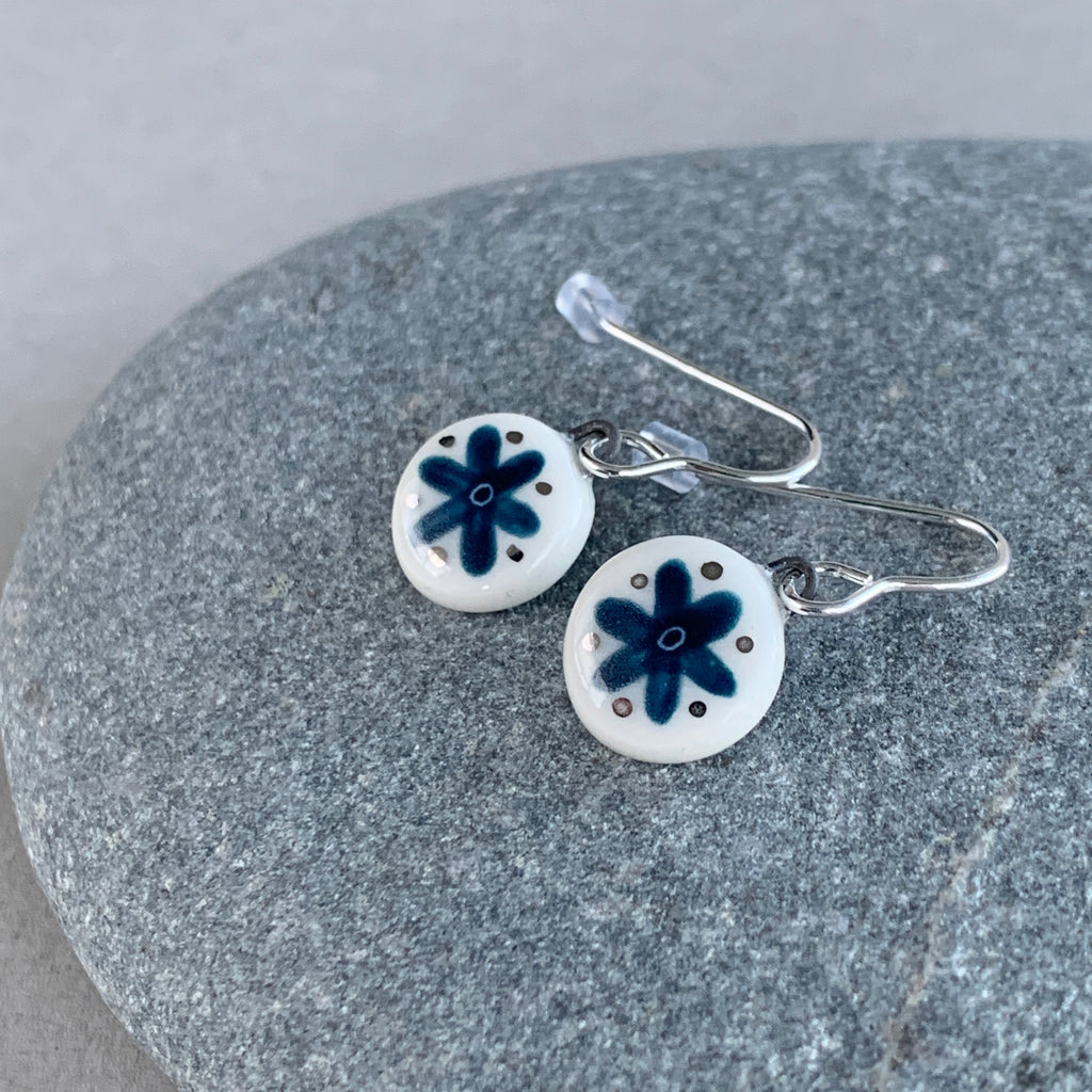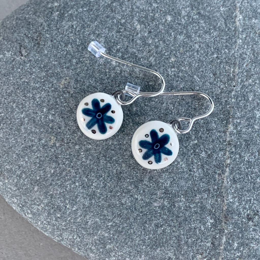 A pair of handmade porcelain and recycled sterling silver earrings with a hand painted flower design and platinum details.