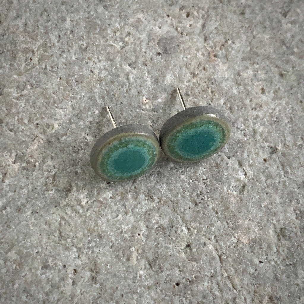 Handmade porcelain stud earrings with hand painted layered green glazes and sterling silver posts and scrolls.