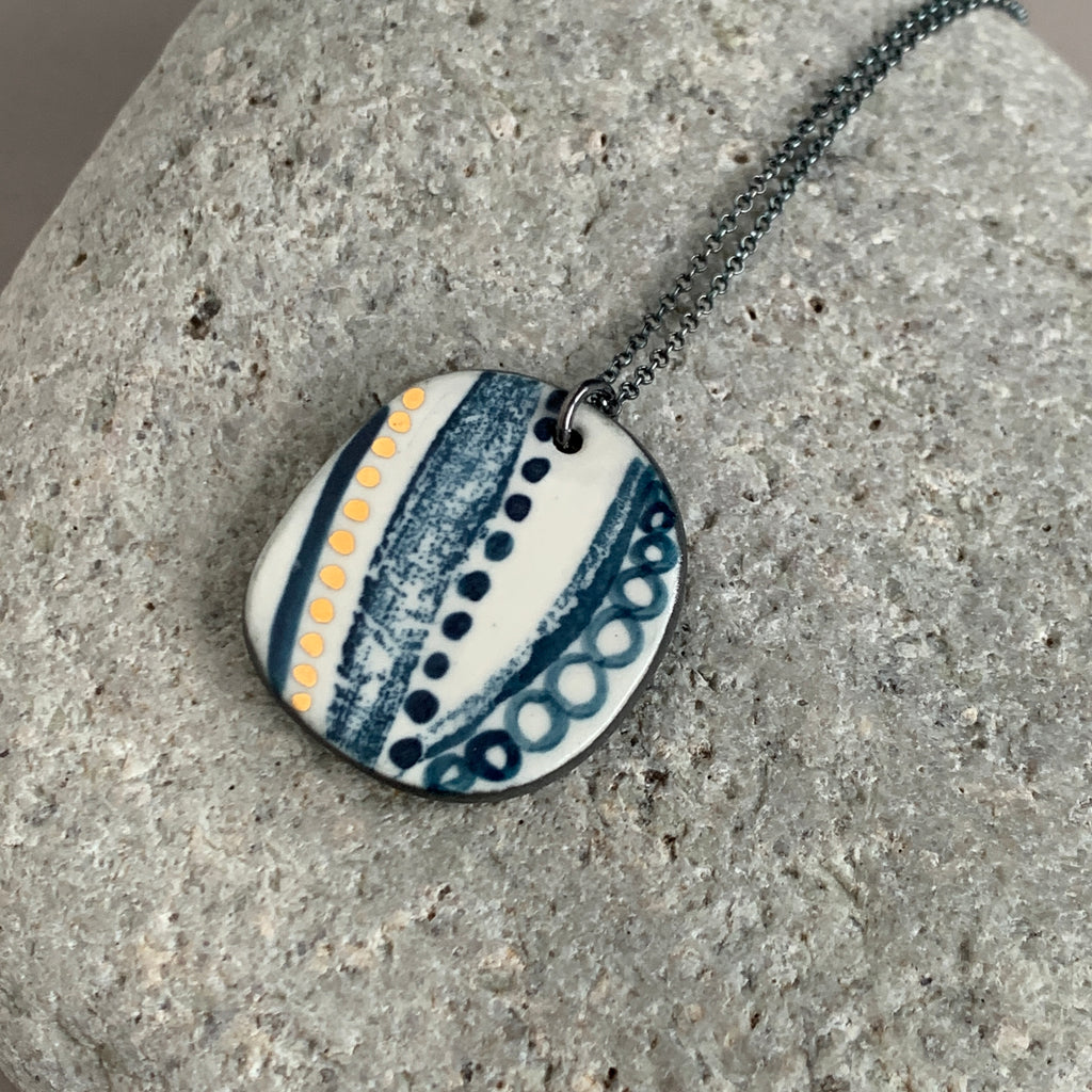 Hand made one-off necklace. Made from high fired black porcelain clay with a hand painted design and 24ct gold details. The necklace has an 18 inch oxidised sterling silver chain.
