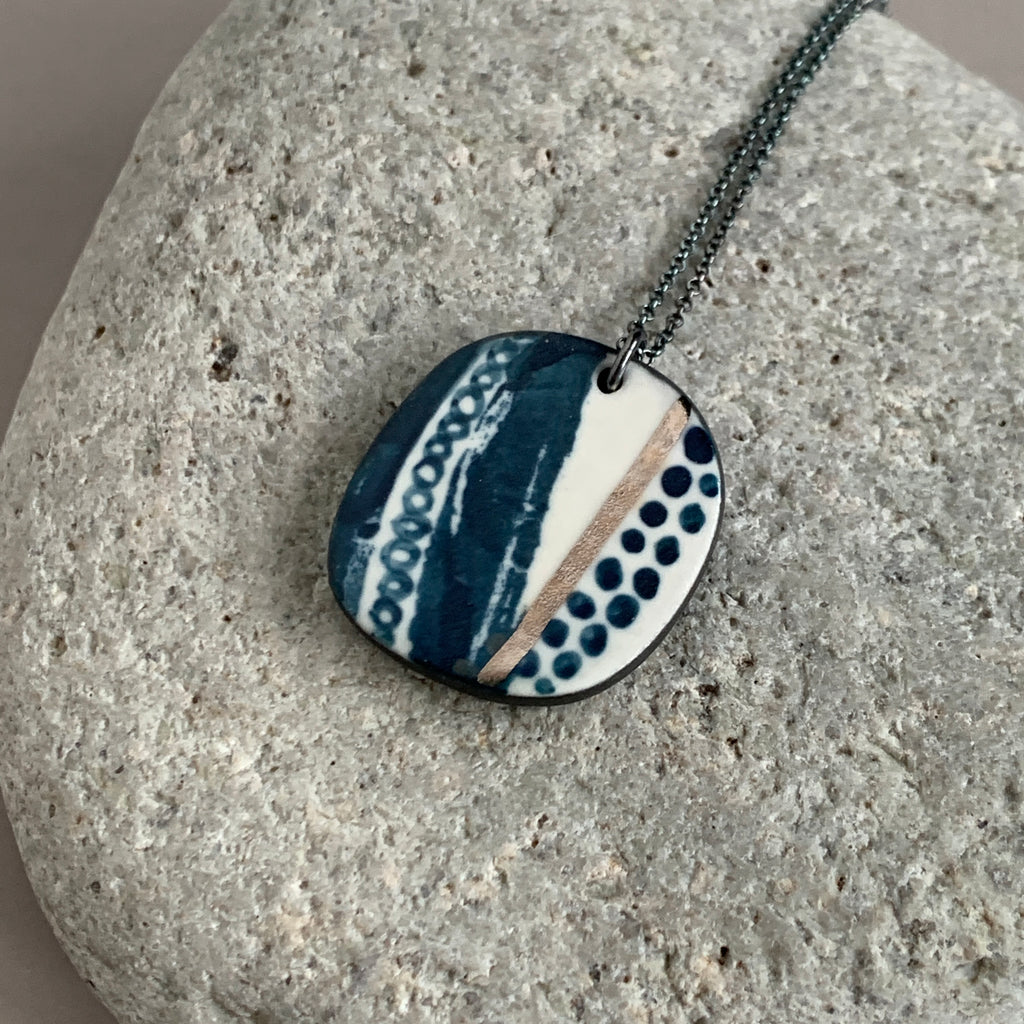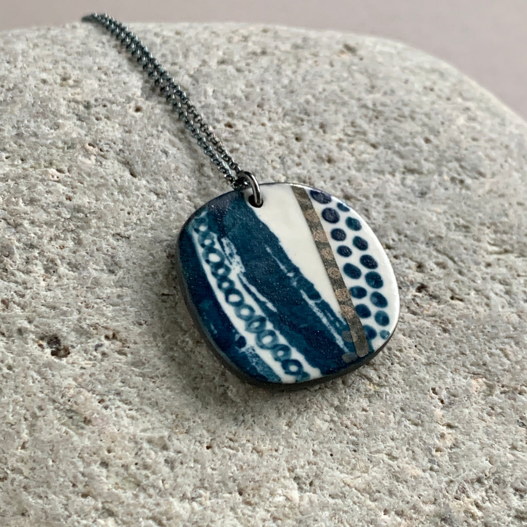 Hand made one-off necklace. Made from high fired black porcelain clay with a hand painted design and platinum details. The necklace has an 18 inch oxidised sterling silver chain.