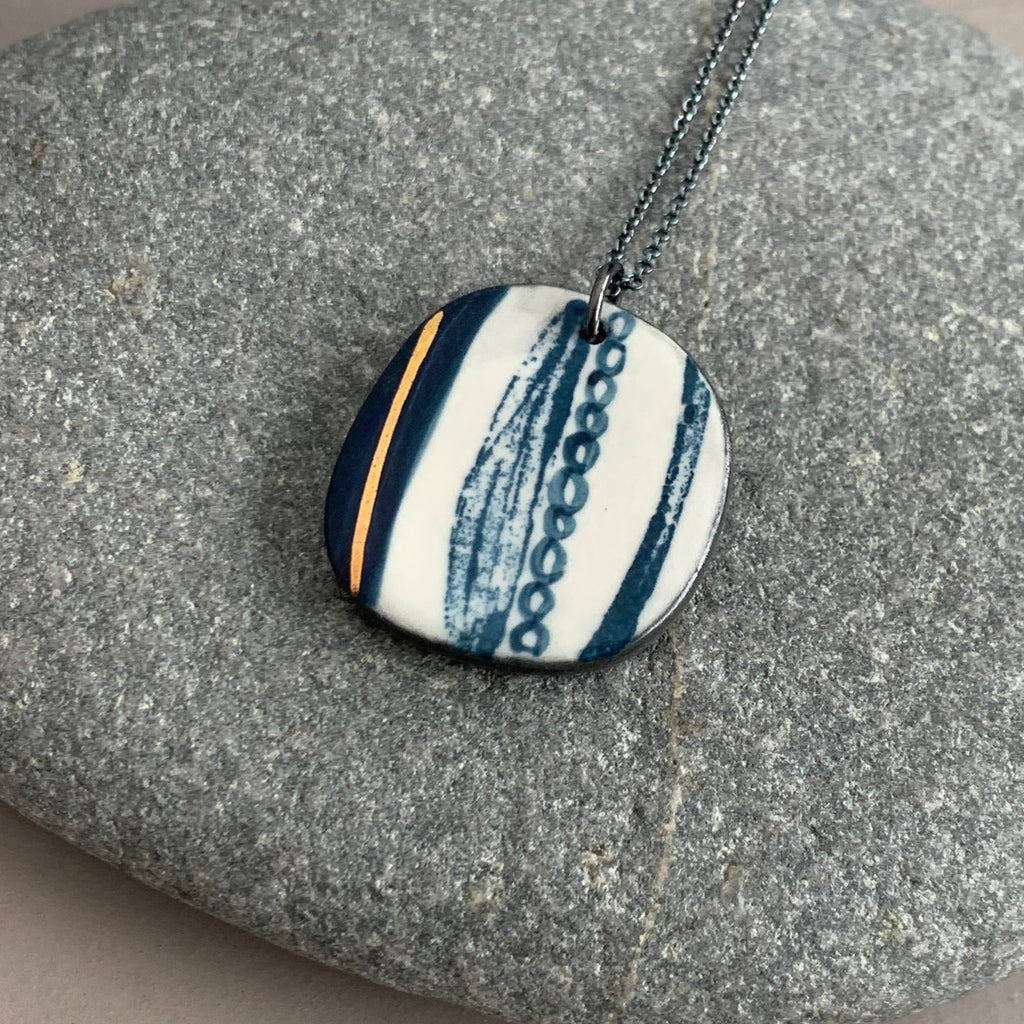Hand made one-off necklace. Made from high fired black porcelain clay with a hand painted design and 24ct gold details. The necklace has an 18 inch oxidised sterling silver chain.